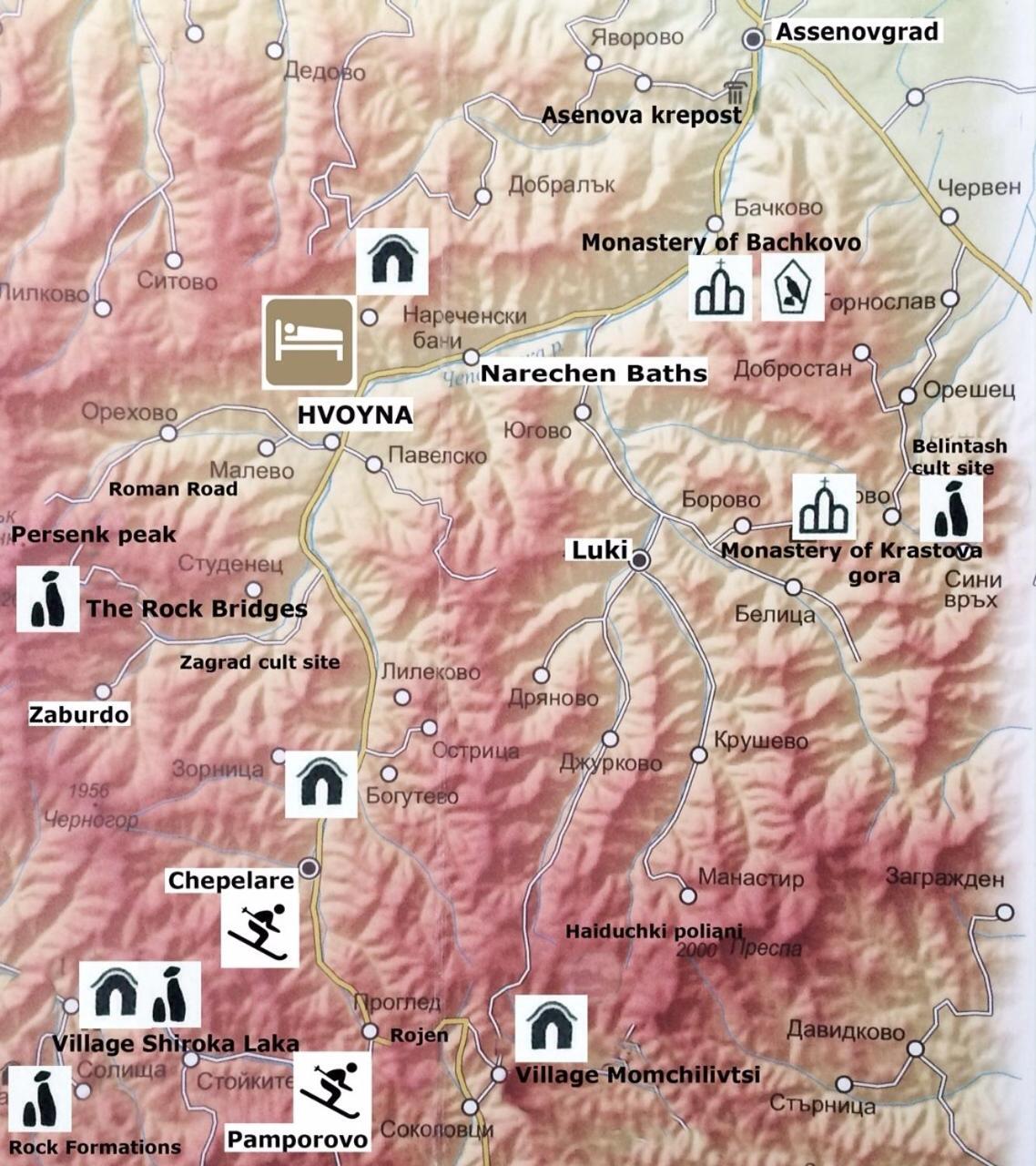 Situated in Hvoyna, 23 km from Bachkovo Monastery, Hotel Hinovi Hvoyna features accommodation with a shared lounge, free private parking, a terrace and a restaurant. Built in 2015, the property is within 22 km of The Wonderful Bridges. The accommodation provides a shared kitchen and free WiFi.